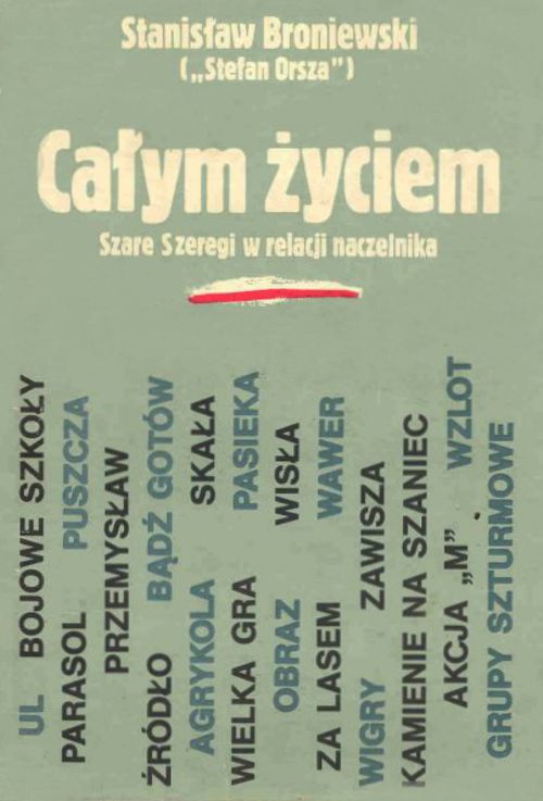 Całym życiem" nie jest klasycznym wojennym pamiętnikiem. To raczej sprawozdanie z wypełnionej pracy, zestawienie założeń z efektami, wreszcie rachunek sumienia dowódcy. Konspiracyjne harcerstwo stanowiło bezpośrednią kontynuację przedwojennego ZHP dostosowanego do warunków okupacji. Z jednej strony, jako jedna z instytucji podziemnego państwa, miało kontynuować jak najszerzej pojętą pracę wychowawczą. Równocześnie istniały zadania czysto wojskowe. Szare Szeregi należały do szerokiego zaplecza Armii Krajowej. Harcerski rodowód miały m.in. powstańcze bataliony "Zośka" i "Parasol", których walka stała się jednym z symboli powstańczej legendy. Książka Broniewskiego oddaje ten dwoisty, edukacyjny i zarazem militarny charakter harcerskiej służby. Autor przedstawia zadania i prace kolejnych stopni szaroszeregowej organizacji - najmłodszych "Zawiszaków", następnie Bojowych Szkół, wreszcie Grup Szturmowych. Przypomina typowe, jak i najbardziej znane akcje, w których brali udział harcerze. (Sam Broniewski dowodził między innymi słynną akcją pod Arsenałem). Relacja spisana została rzeczowym, niemal "dziennikarskim" językiem. Nie jest jednak świadectwem pozbawionym emocji. Naczelnik Szarych Szeregów musiał, bowiem, opisać śmierć większości spośród swoich kolegów i podwładnych. Powstaniu poświęcona jest piąta część - "Przełom". Sam opis nie wnosi niczego nowego do naszej wiedzy o warszawskiej walce, uświadamia natomiast różnorodność harcerskiej służby - od biorących udział w najcięższych walkach żołnierzy Grup Szturmowych, po zapełniających namiastkę zwykłego życia "Zawiszakach" z powstańczej poczty. Książka komendanta "Orszy" jest uzupełnieniem znanych ze szkolnych lektur prac Aleksandra Kamińskiego. (źródło opisu: http://www.sppw1944.org/index.html?http://www.sppw...(?).